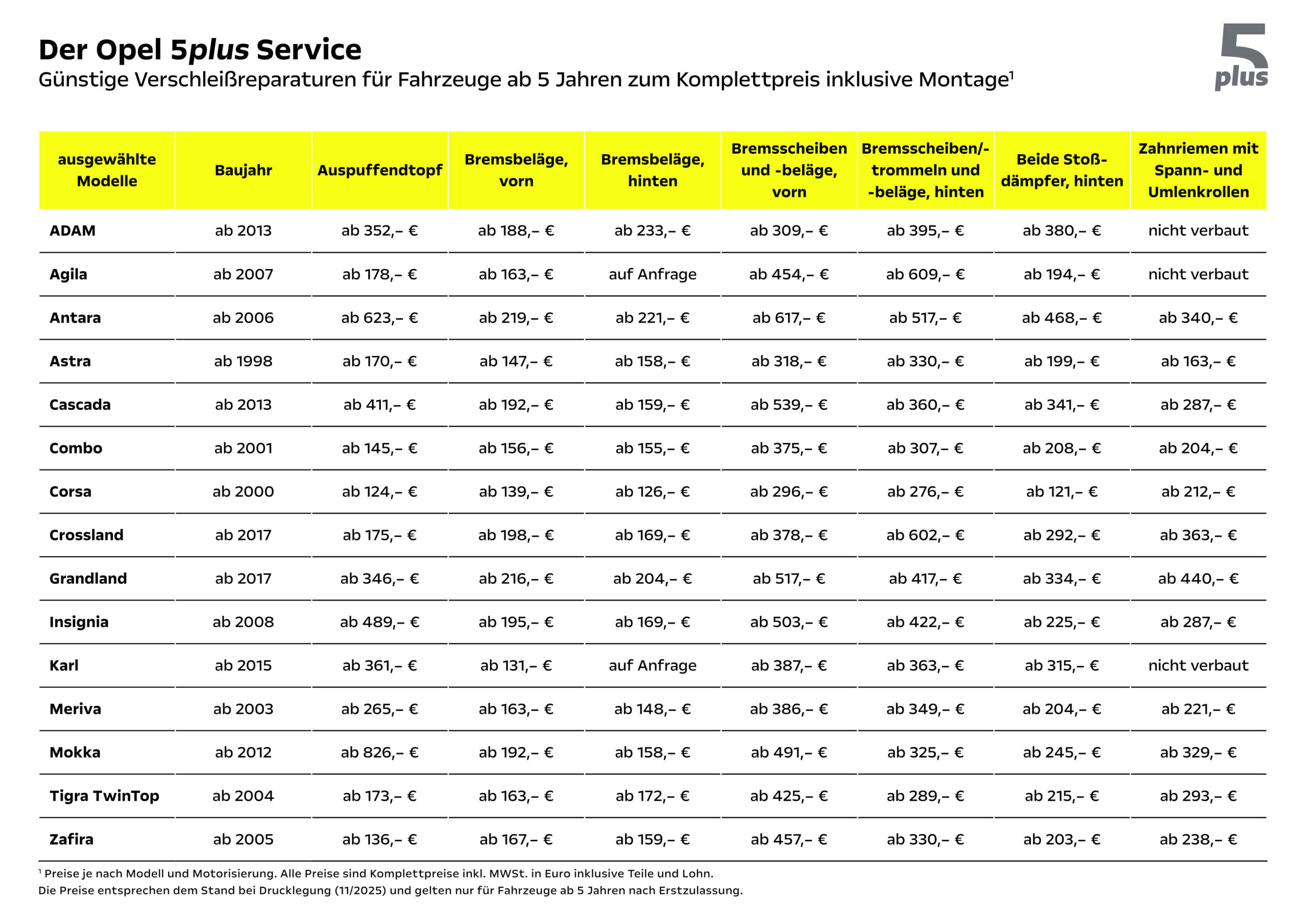 Verschleißreparaturen für Opel ab dem 5. Jahr nach Erstzulassung zu sensationellen Komplettpreisen.